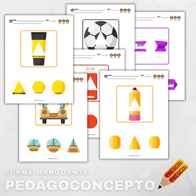 6 fiches où l’enfant doit encercler la bonne forme manquante pour compléter l’image.