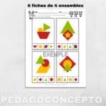 Comprenant 6 pages de 4 ensembles chacun où l’enfant doit observer et faire un X sur la forme n’ayant pas été utilisée.