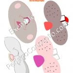 4 modèles de bas de visages de lapins et 2 de poussins ainsi que 4 paires d’oreilles de lapin et 2 hauts de têtes de poussins.  Activité ludique à l’occasion de Pâques.