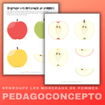 3 couleurs de pommes entières + 6 morceaux de pommes à regrouper selon la couleur.