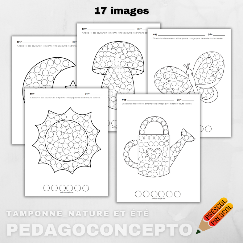 L’enfant doit tamponner avec des marqueurs à bingo les 17 images en lien avec la nature ou l’été.